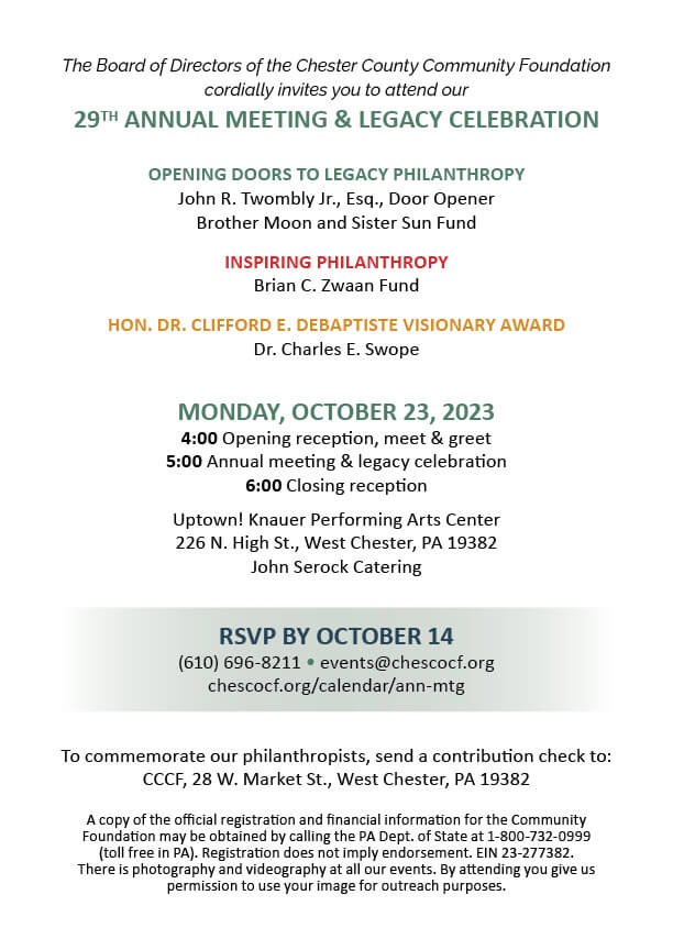 The Board of Directors of the Chester County Community Foundation cordially invites you to attend our 29TH ANNUAL MEETING & LEGACY CELEBRATION