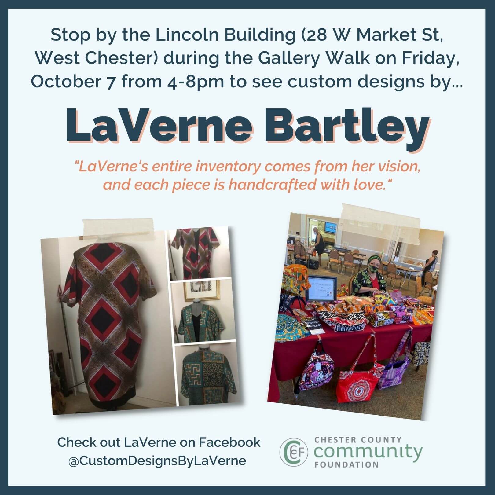 Sewing has been a part of LaVerne’s life since she was a child, making clothing for her favorite dolls. This grew into her designing clothing and doing alterations for close friends and family. After retirement, at the urging of her family, she decided to share her gift and Custom Designs by LaVerne was born. LaVerne’s entire inventory comes from her vision, and each piece is handcrafted with love.