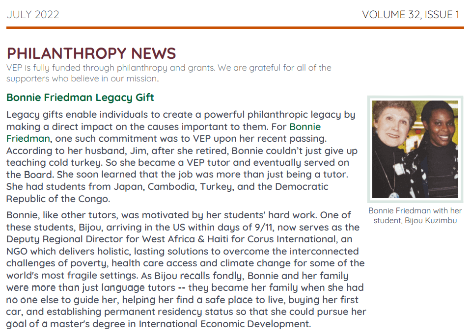 The Fund was established to honor the legacy of Bonnie Friedman. Bonnie was a graduate of Grove City College where she earned a BA in teaching. She taught in the Downingtown School District for 22 years. After she retired, she couldn’t give up teaching and became a tutor and eventual Board member of the Volunteer English Program of Chester County. During her time with VEP, she taught students from Japan, Cambodia, Turkey, and the Democratic Republic of the Congo. For many students, Bonnie was not only their tutor but a valued mentor and friend who guided and supported them in numerous ways.