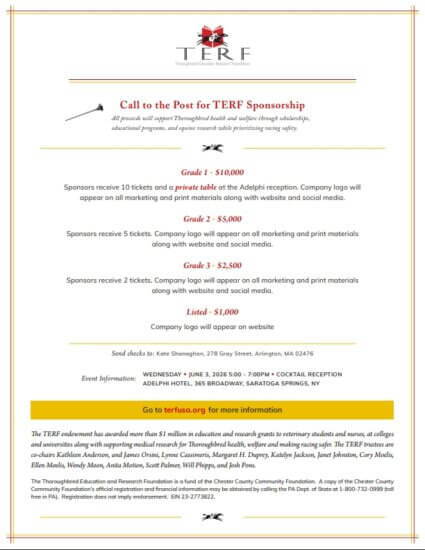 The Trustees of the Thoroughbred Education and Research Foundation (TERF) and the Chester County Community Foundation pay tribute to the incredible life and legacy of Herb Moelis, the founder of TERF. Herb was known for his compassionate and commonsense leadership, in both equine and human communities. He and his wife Ellen followed their dreams to support Thoroughbred health and welfare by funding scholarships, educational programs, and equine research. Herb will be deeply missed. Donations may be made in his memory to the Thoroughbred Education and Research Foundation. Click here to read his obituary.