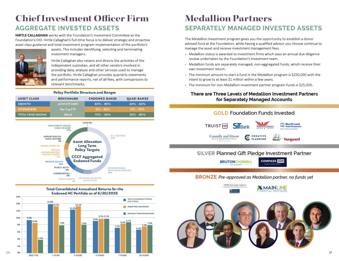 The Chester County Community Foundation is committed to prudent investment strategies and fiscal policies which the Foundation believes will lead to the long-term growth of endowment fund principal and meet spending policy objectives. The Community Foundation seeks to preserve and enhance the value of the portfolio’s assets by providing long-term growth greater than the rate of inflation and fee costs, while recognizing that prudent risks must be taken.